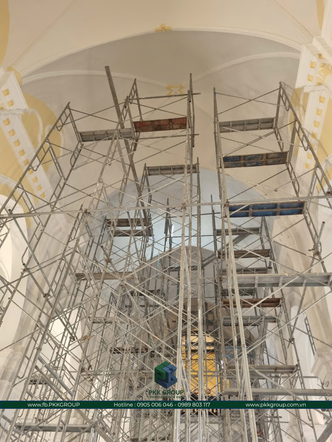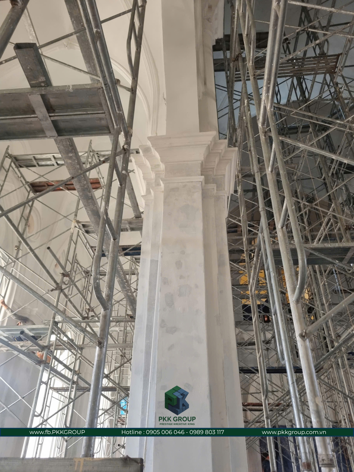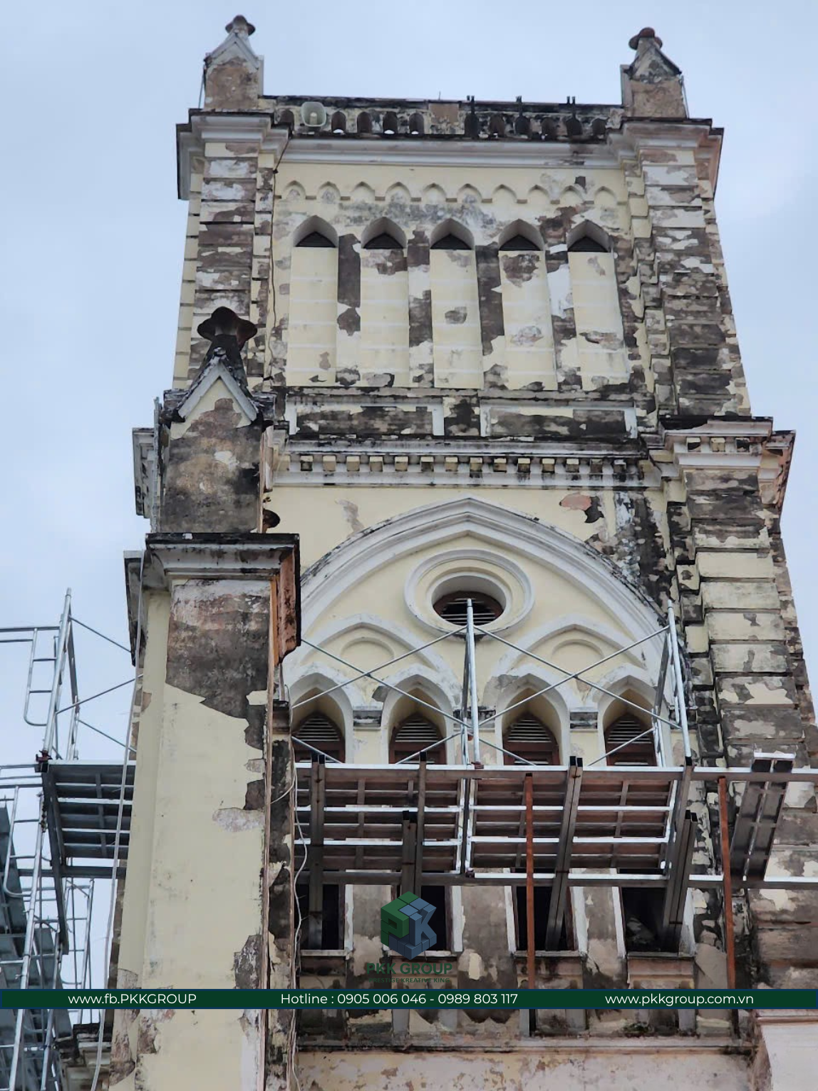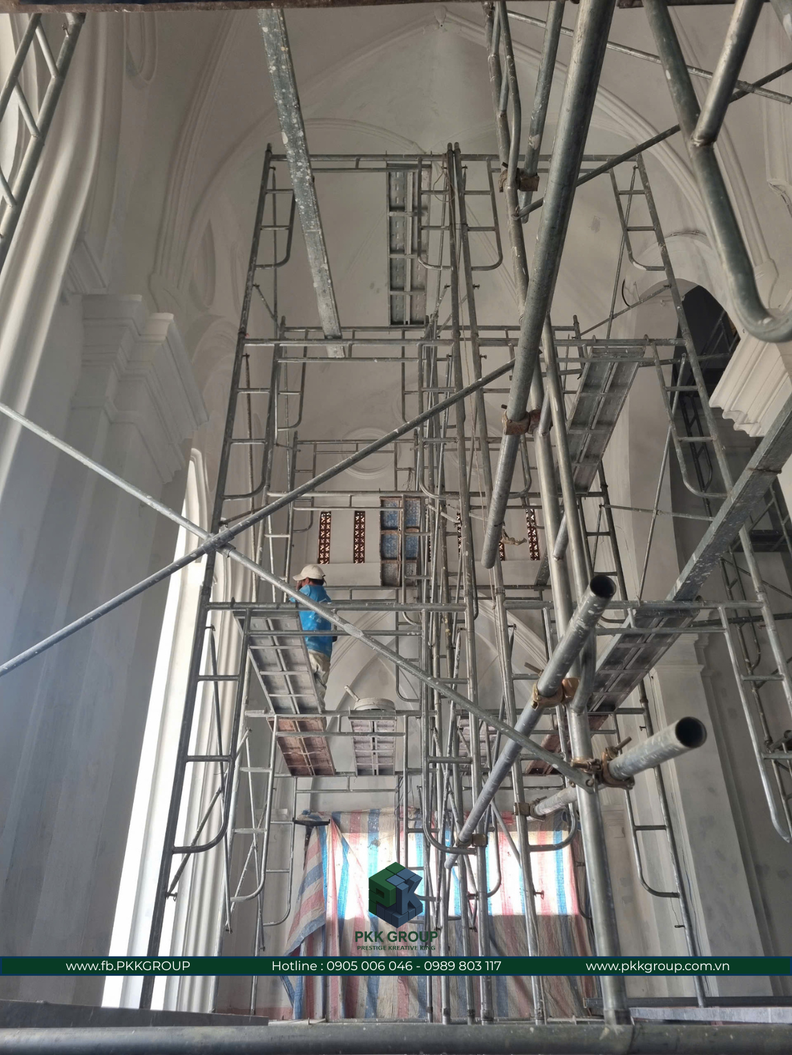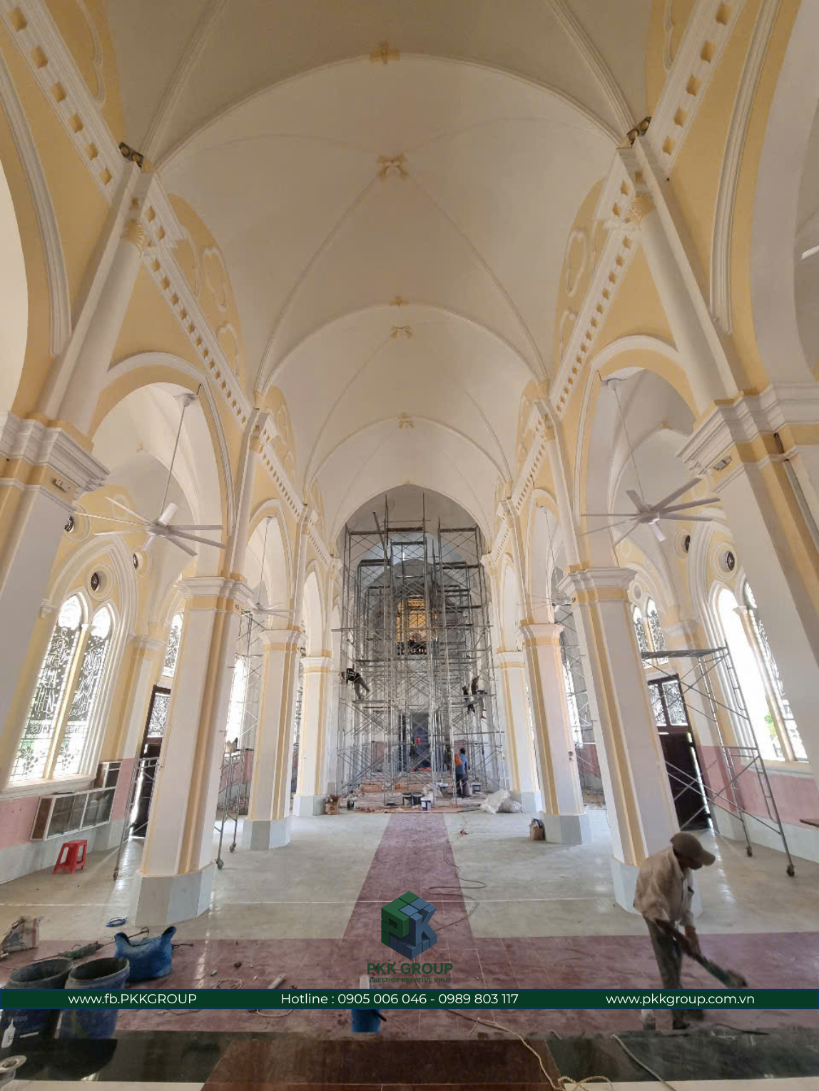 Sau giai đoạn đầu khảo sát hiện trạng và xử lý bề mặt, đội ngũ PKK Group tiếp tục triển khai các hạng mục cải tạo bên trong Nhà thờ Tấn Tài – một công trình mang giá trị tinh thần và dấu ấn kiến trúc Gothic đặc trưng của Phan Rang.