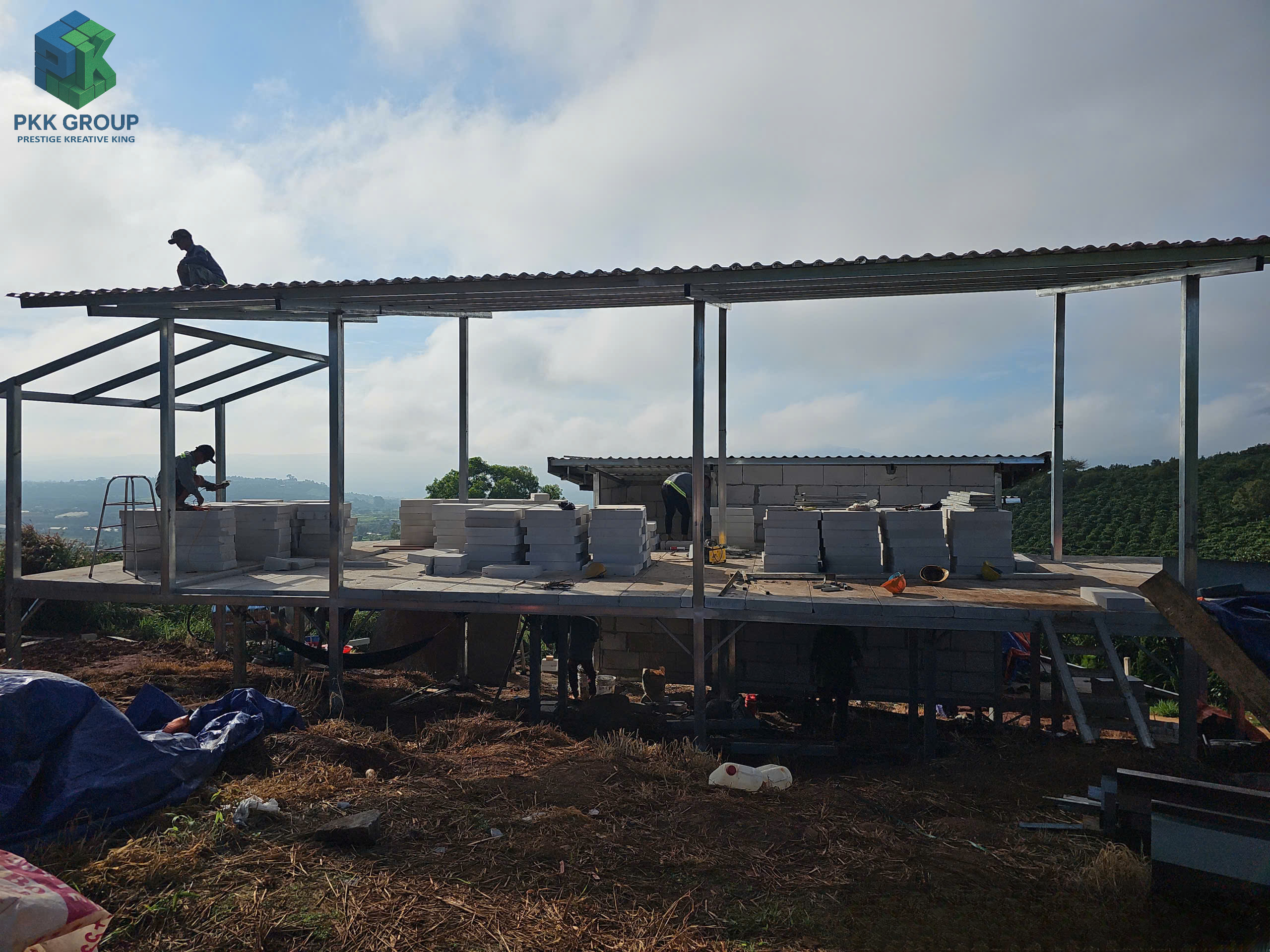 Duong’s Villa – Lâm Đồng tiếp tục “lên hình” rõ nét giữa triền đồi xanh mướt. Sau giai đoạn định vị, hoàn thiện móng và dựng khung thép, hiện công trình do PKK GROUP thi công đã bước vào giai đoạn hoàn thiện phần thô quan trọng: lợp mái, lắp sàn – dựng tường, chia không gian công năng.