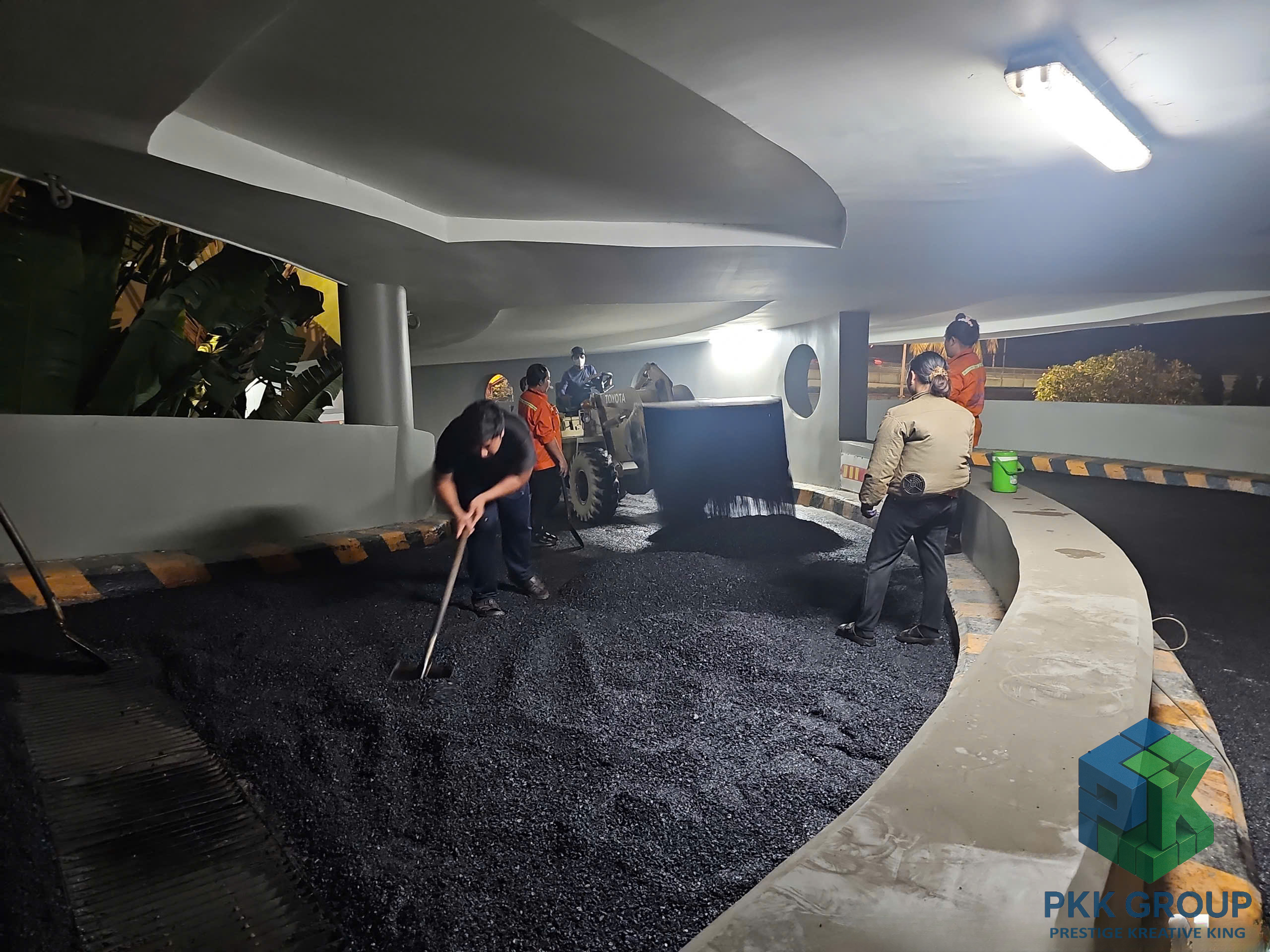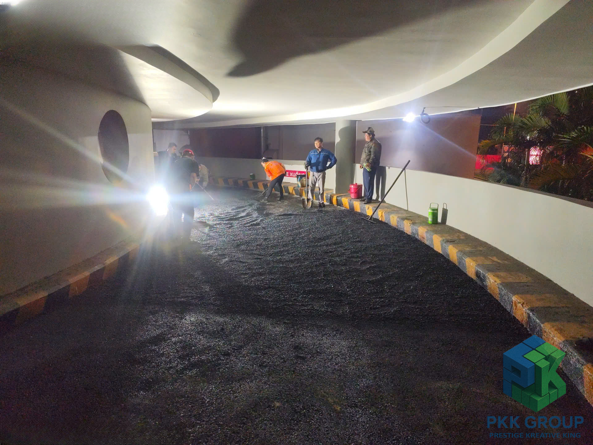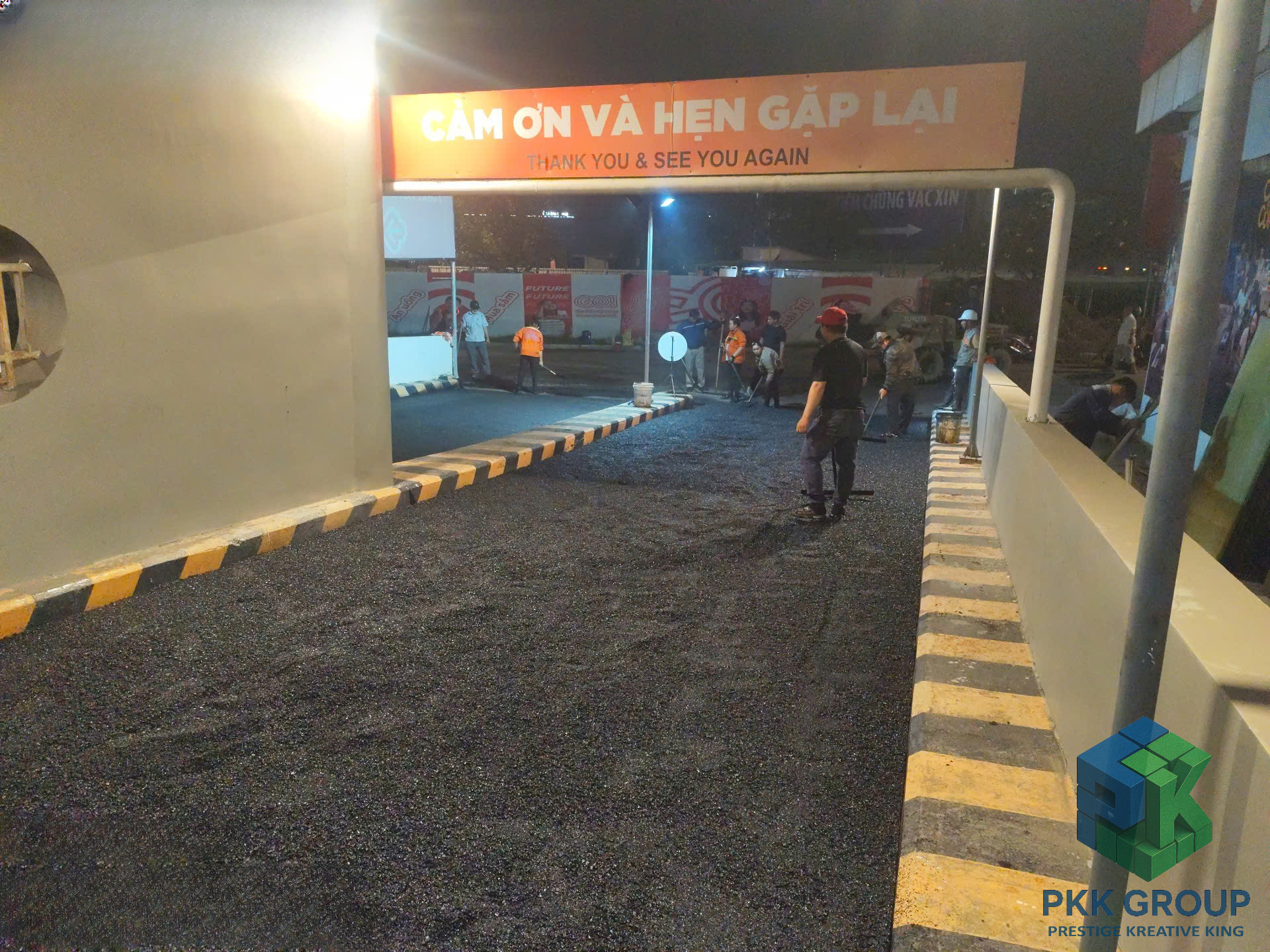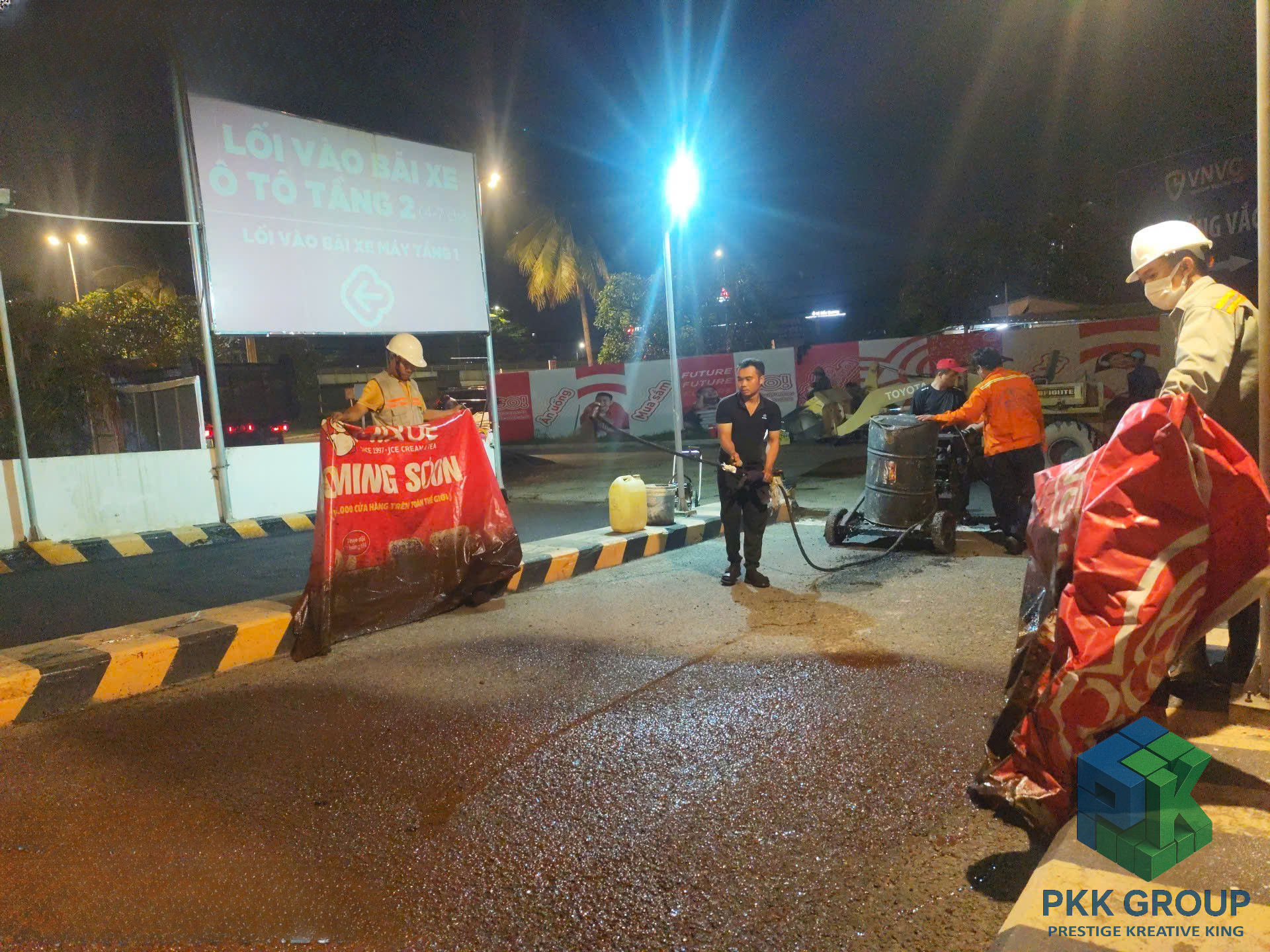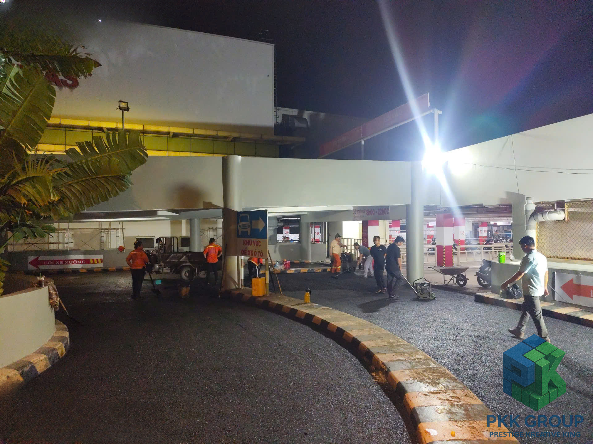 Dù thi công vào ban đêm để tránh ảnh hưởng hoạt động siêu thị, tập thể anh em PKK Group vẫn giữ tinh thần làm việc nghiêm túc, phối hợp chặt chẽ để đảm bảo chất lượng từng mét đường.