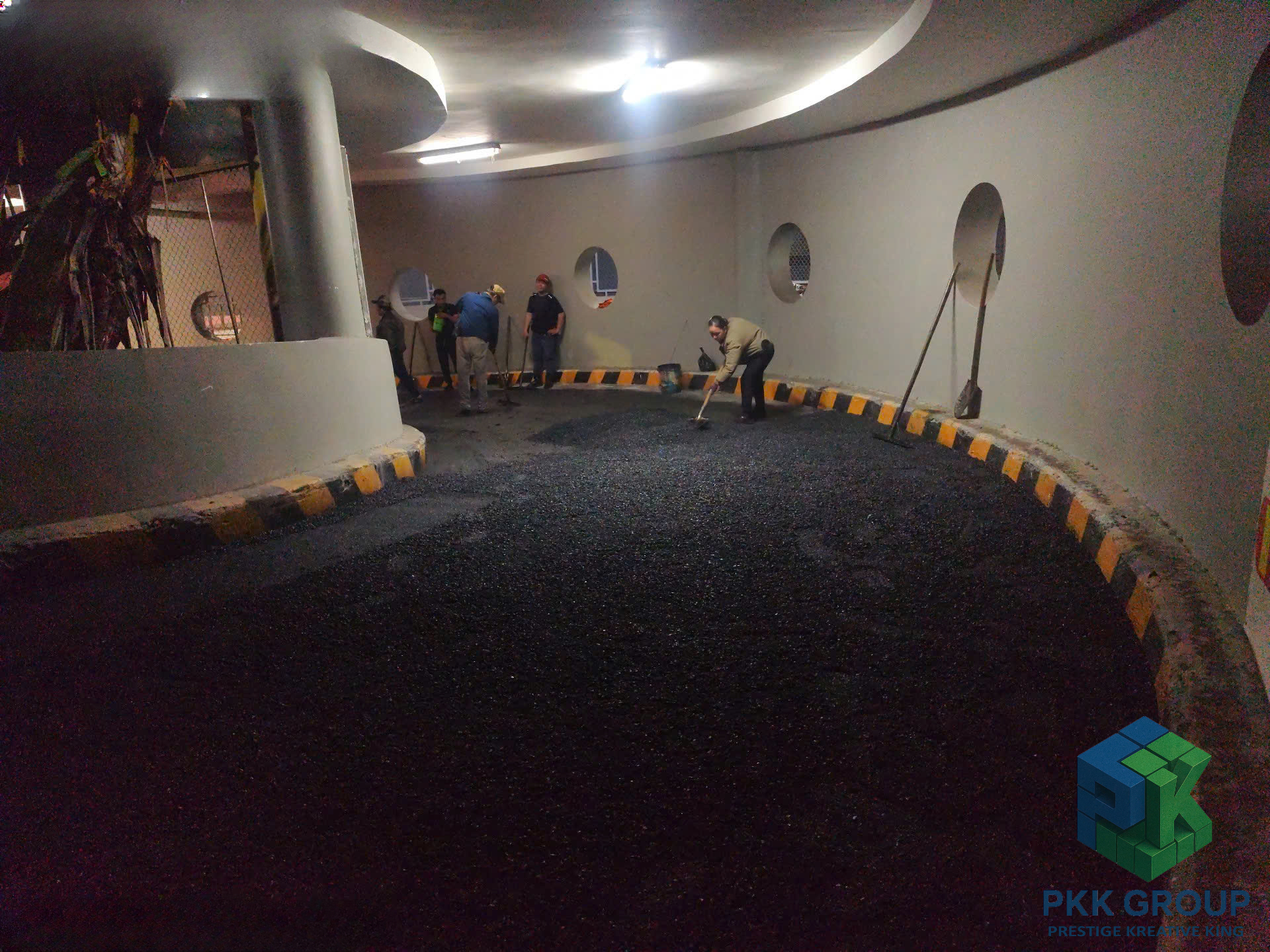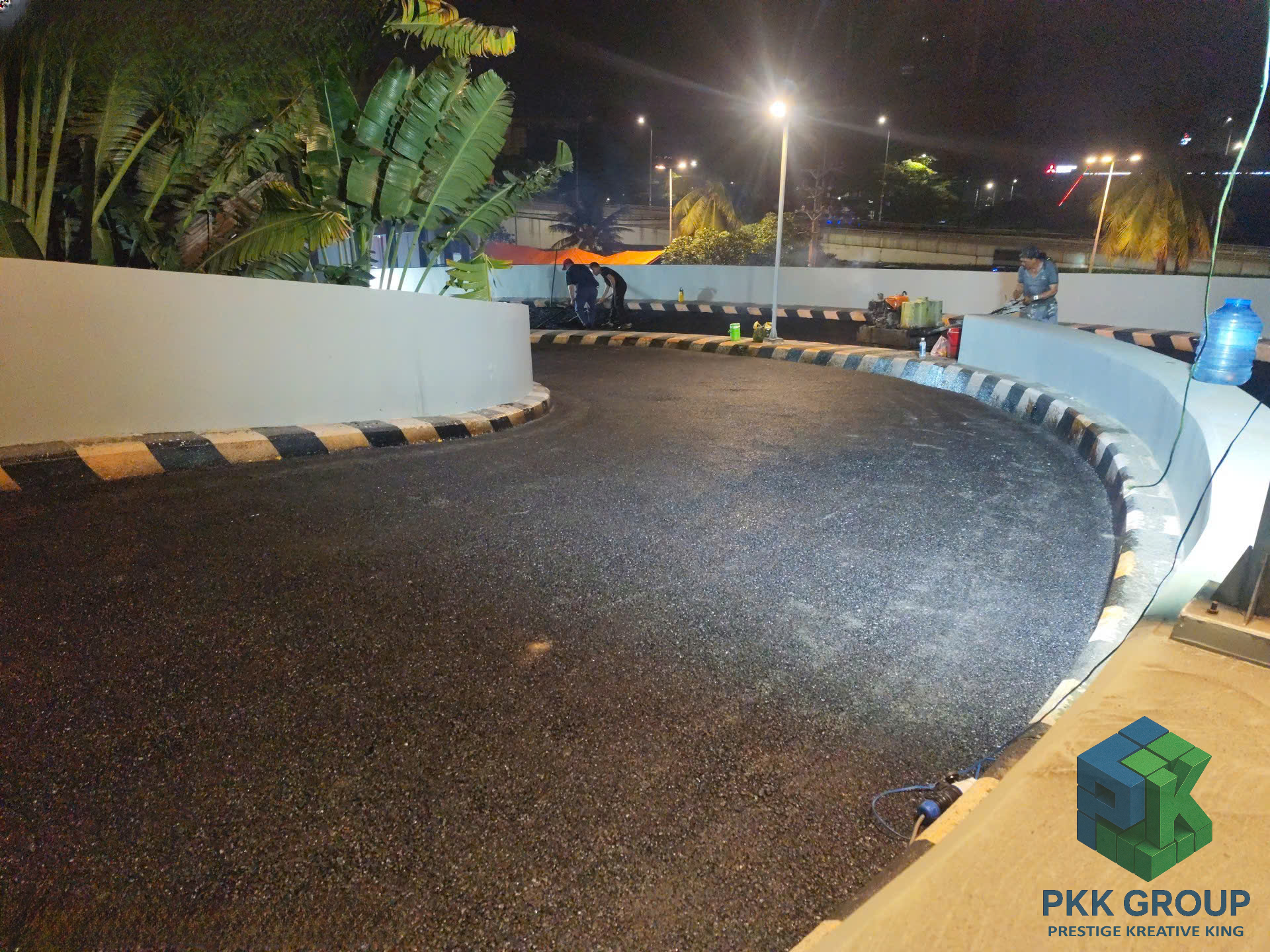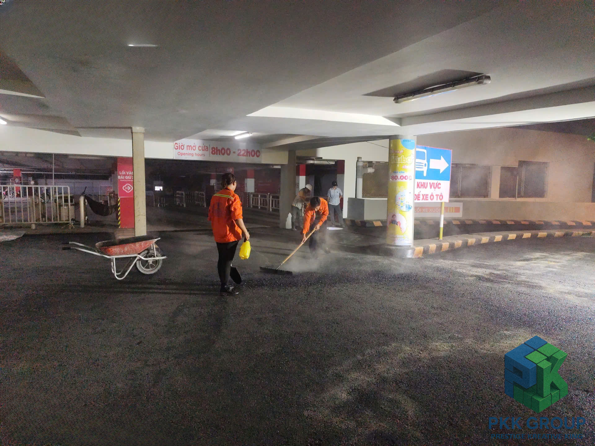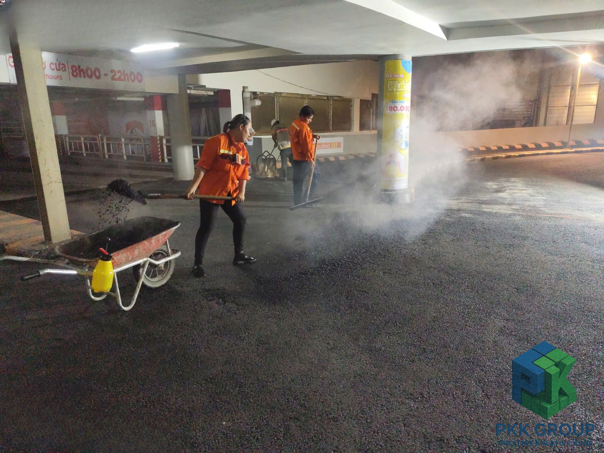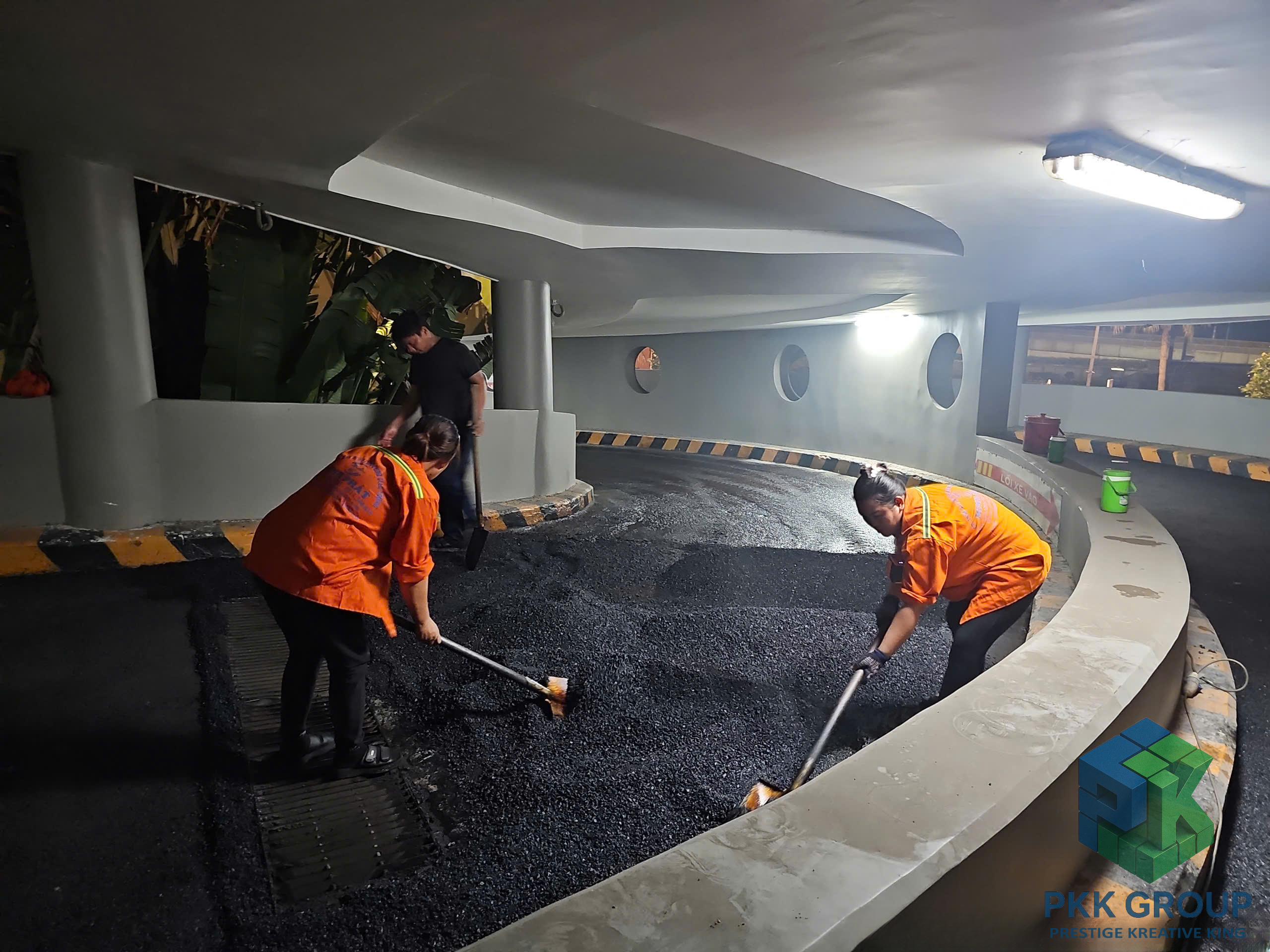 Dù thi công vào ban đêm để tránh ảnh hưởng hoạt động siêu thị, tập thể anh em PKK Group vẫn giữ tinh thần làm việc nghiêm túc, phối hợp chặt chẽ để đảm bảo chất lượng từng mét đường.
