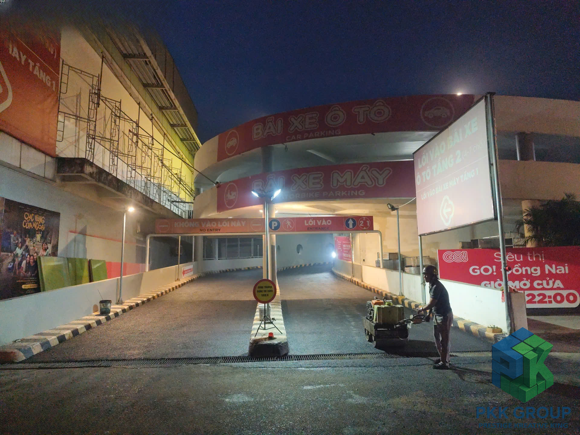 Trong những ngày gần đây, đội ngũ PKK Group đã nỗ lực thi công xuyên đêm để đẩy nhanh tiến độ hoàn thiện hạng mục thảm nhựa đường tại khu vực lối lên xuống bãi xe ô tô và xe máy của Siêu thị GO! Đồng Nai. Đây là một trong những hạng mục quan trọng nhằm đảm bảo lưu thông an toàn, nâng cao trải nghiệm cho khách hàng khi đến trung tâm thương mại.