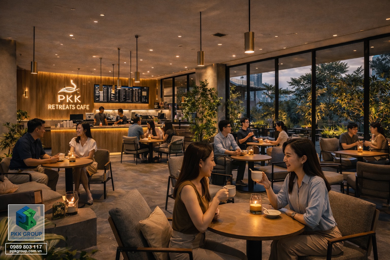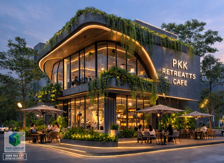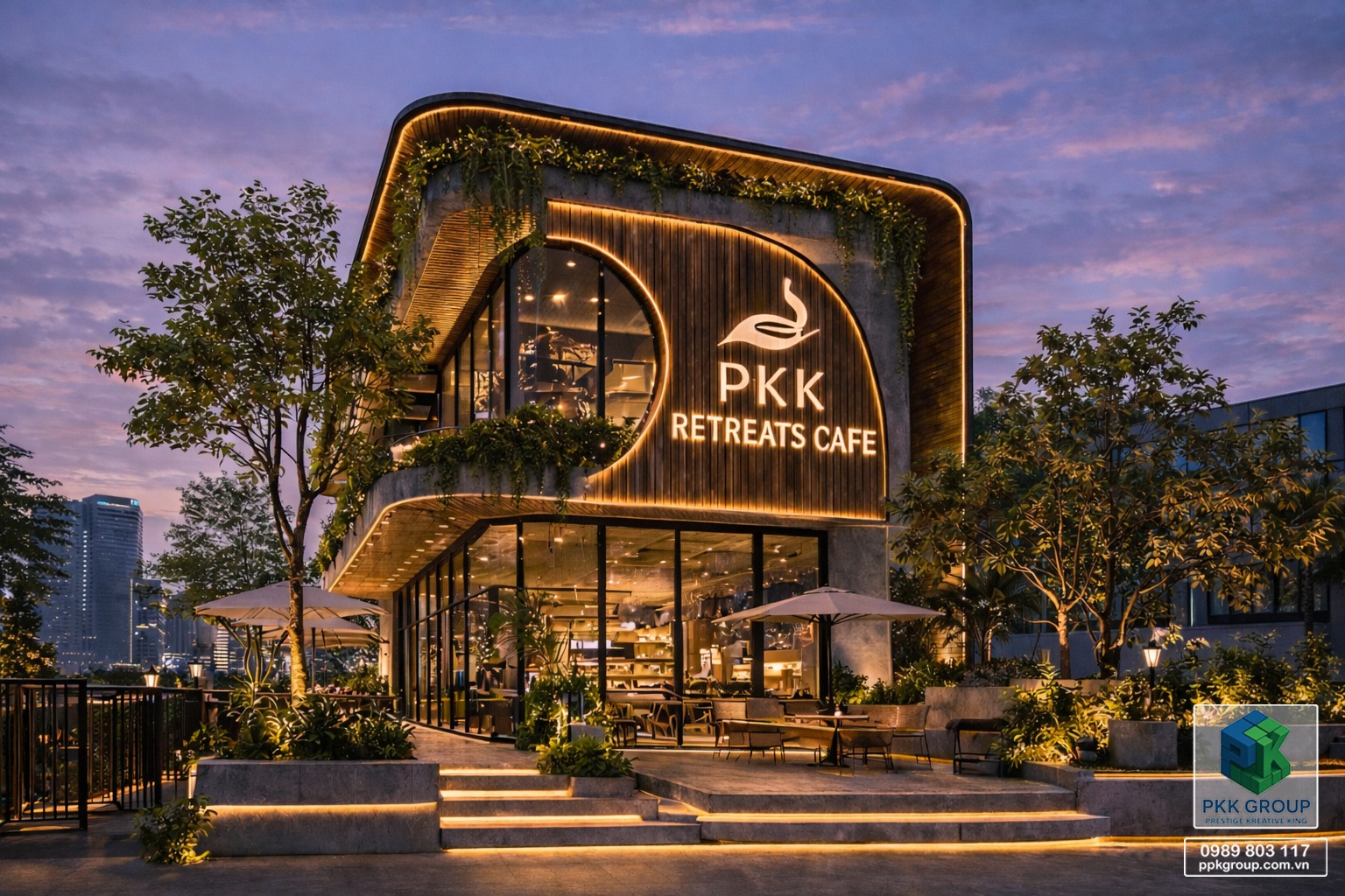 Concept quán cafe do PKK Group phát triển hướng đến phong cách hiện đại, sang trọng và gần gũi thiên nhiên, mang lại trải nghiệm trọn vẹn cho khách hàng ngay từ khi bước vào.