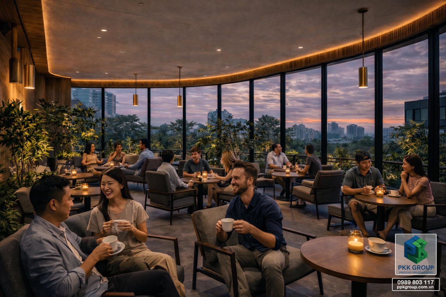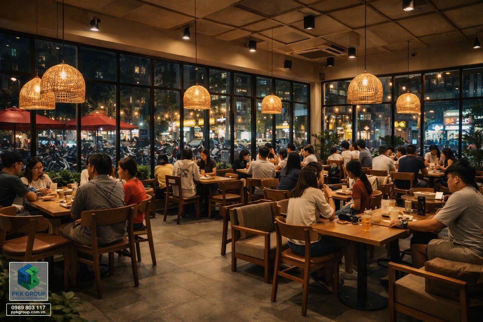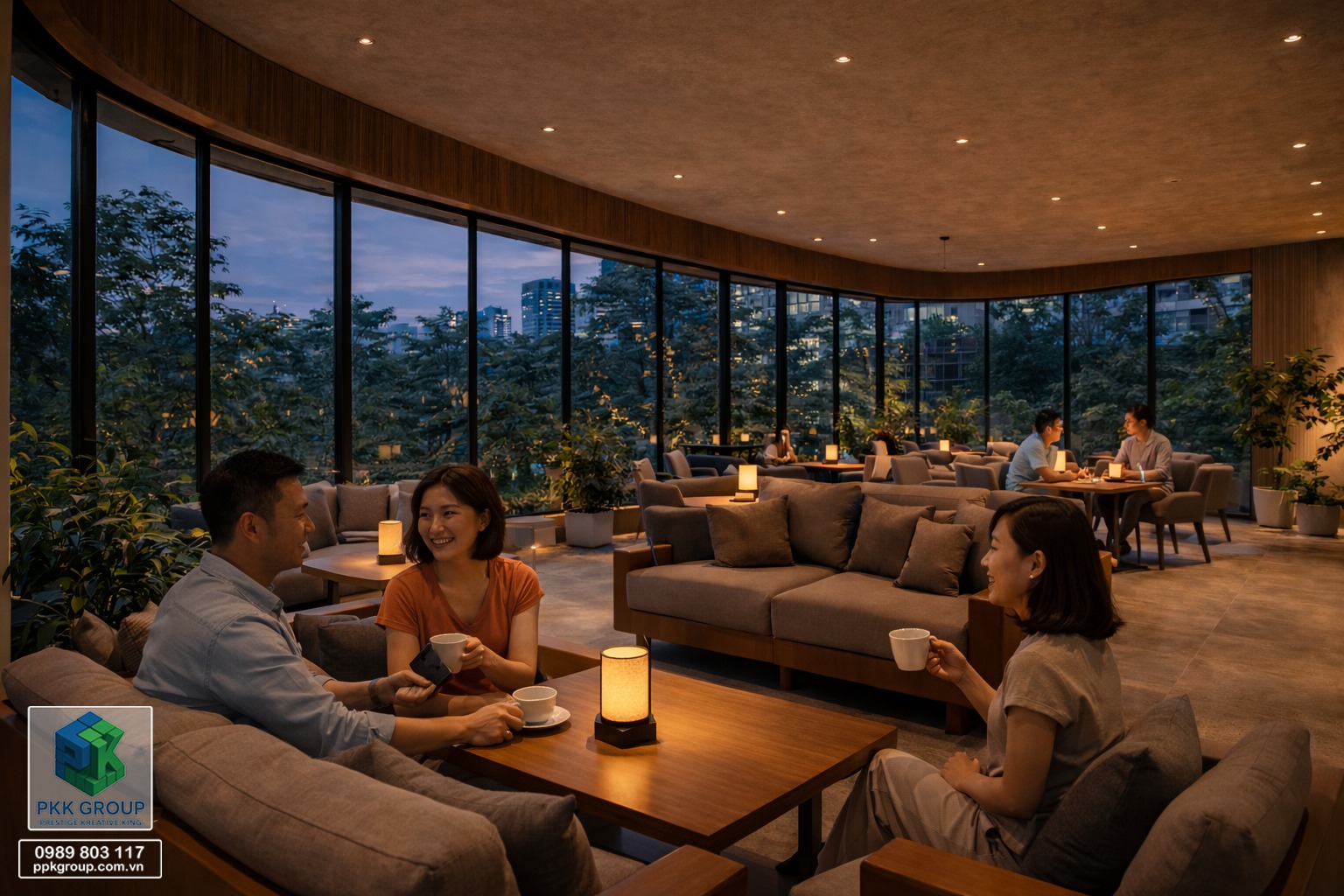 Các khu vực ngồi được bố trí hợp lý với ghế sofa, bàn gỗ và ánh sáng dịu nhẹ, tạo nên một bầu không khí ấm cúng. Hệ thống cửa kính lớn giúp tận dụng ánh sáng tự nhiên vào ban ngày và mở rộng tầm nhìn ra không gian bên ngoài.