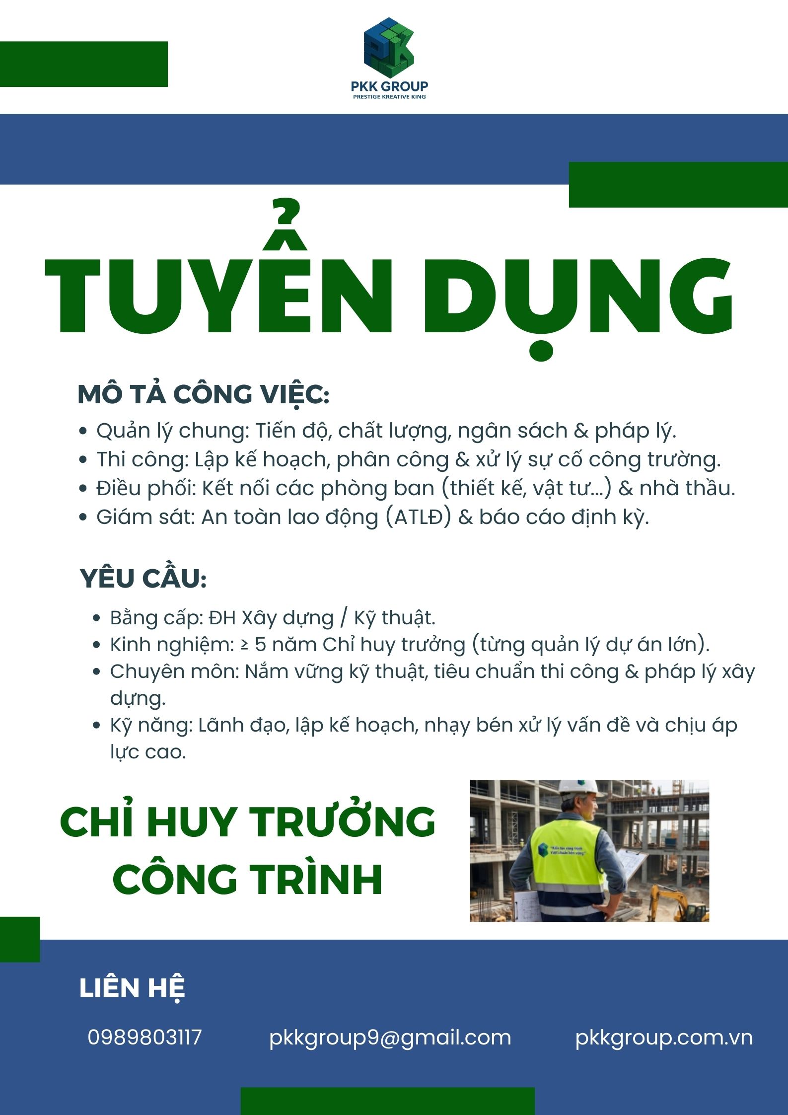 Có ít nhất 5 năm kinh nghiệm ở vị trí Chỉ huy trưởng công trình, có kinh nghiệm quản lý dự án lớn.
