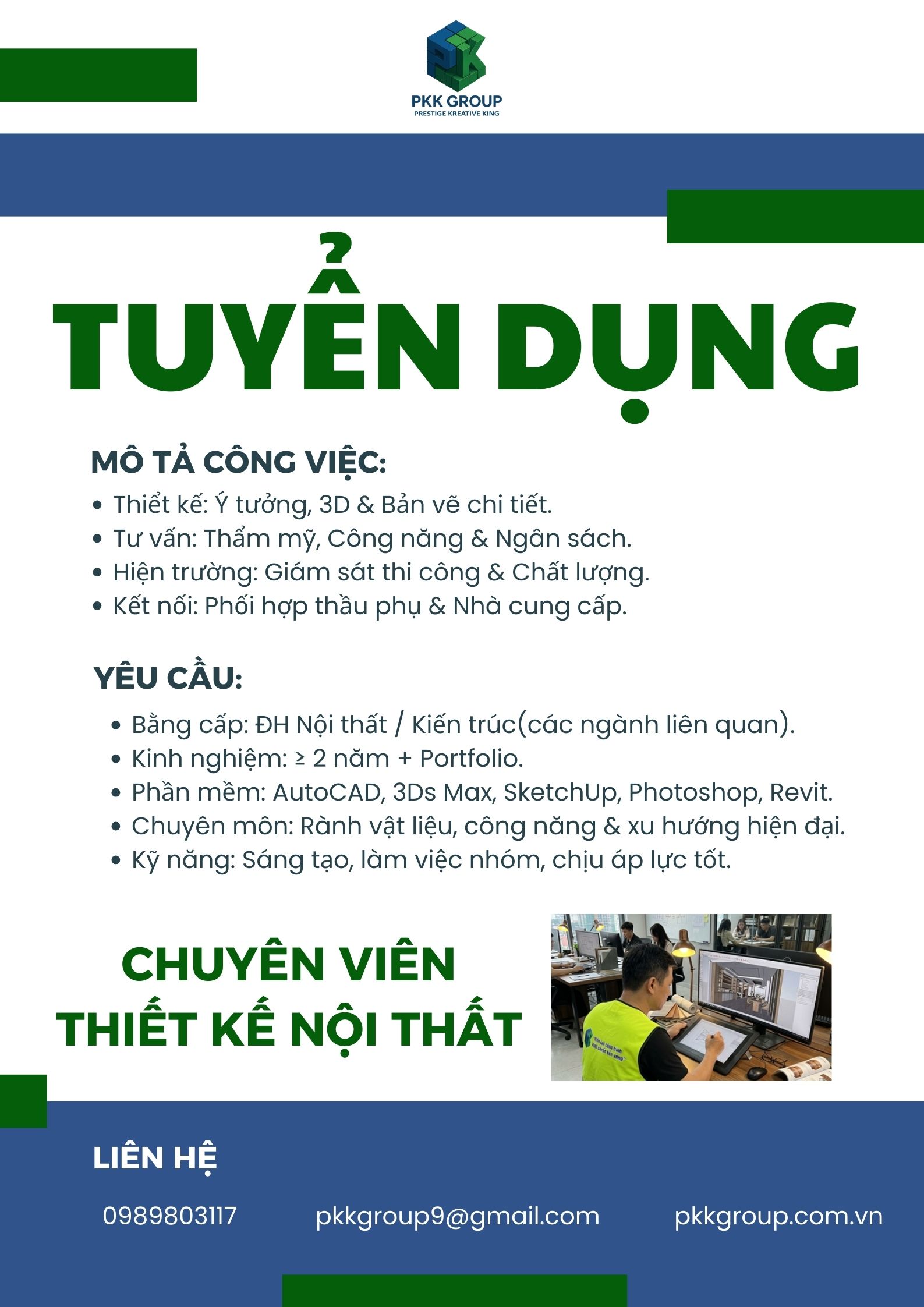Kinh nghiệm thiết kế nội thất từ 2 năm trở lên, có portfolio các dự án thiết kế thực tế (ưu tiên ứng viên có kinh nghiệm trong lĩnh vực xây dựng, dân dụng và công nghiệp).